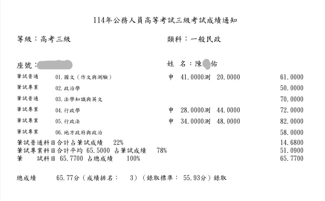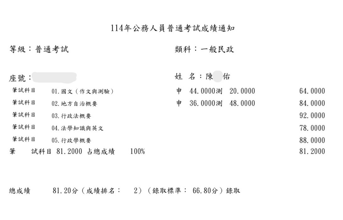 114高普考一般民政-陳O佑上榜心得