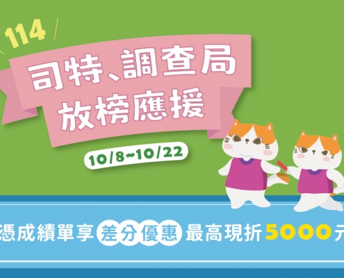 car429tub6472025-07-28 12:21:292025-08-07 16:42:138/1-8/18【 司律、司特、調查局考場優惠】憑考試通知書最高折3000