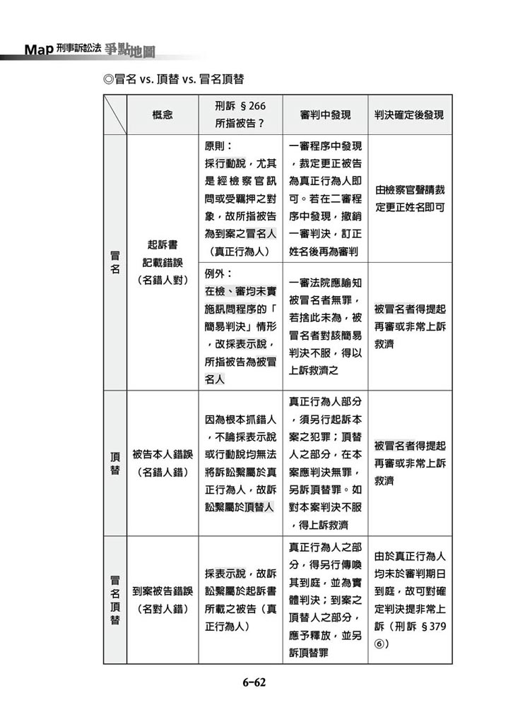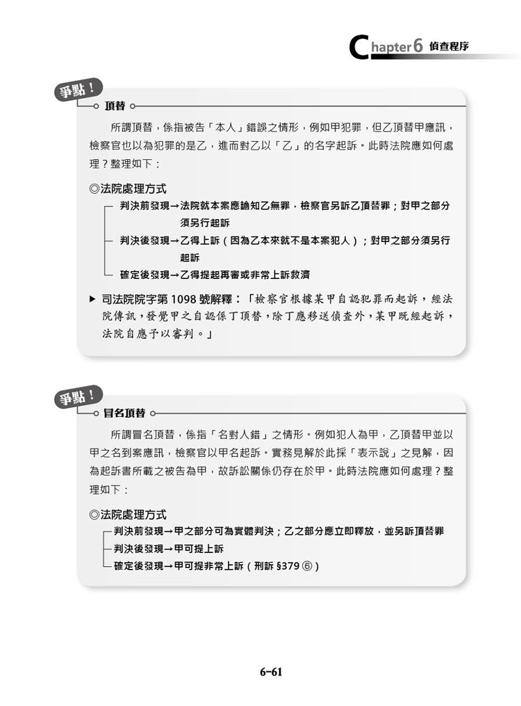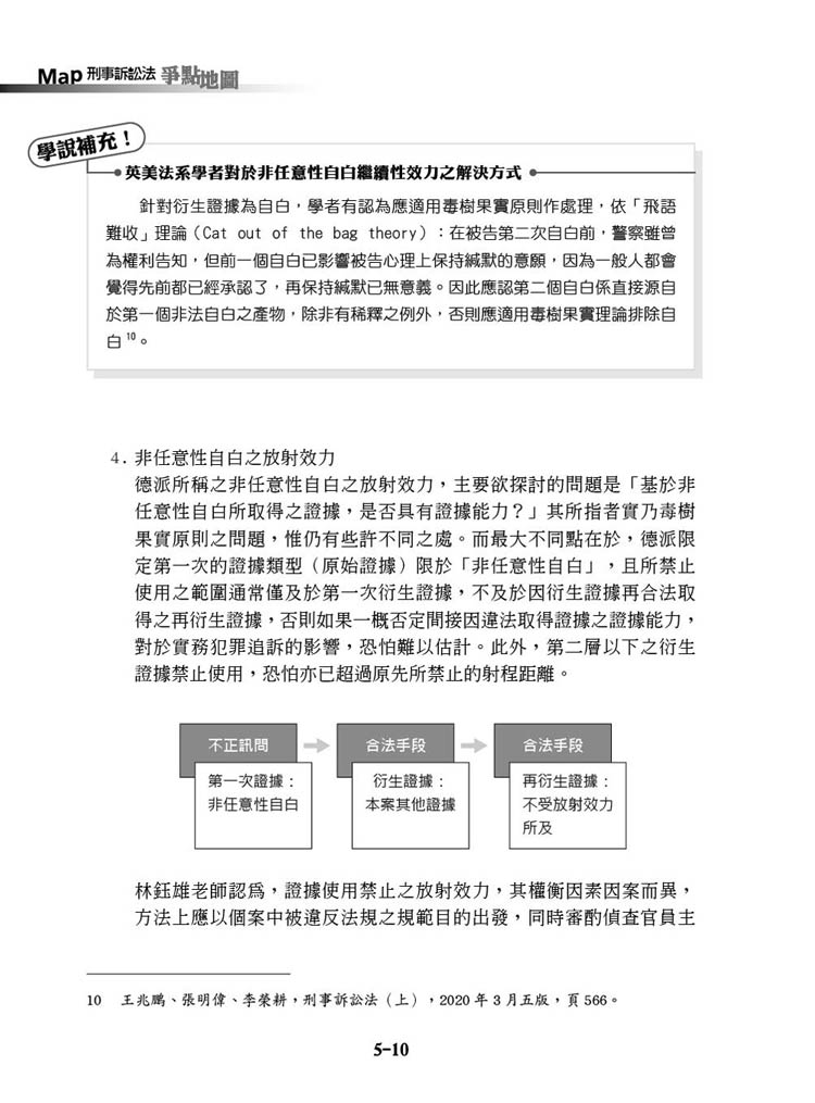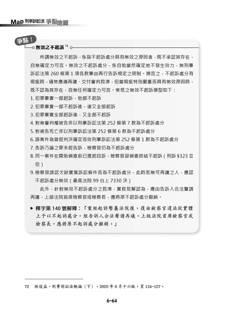 本書五版新收錄了113年修正的科技偵查相關條文,以及112年修正的聲請准許自訴制度、鑑定新法相關爭點,並補上前次改版後所新增的憲法法庭判決、最高法院刑事大法庭裁定,更新幅度頗大,若經濟狀況允許,還是建議入手一本作為考前爭點快速複習之用。