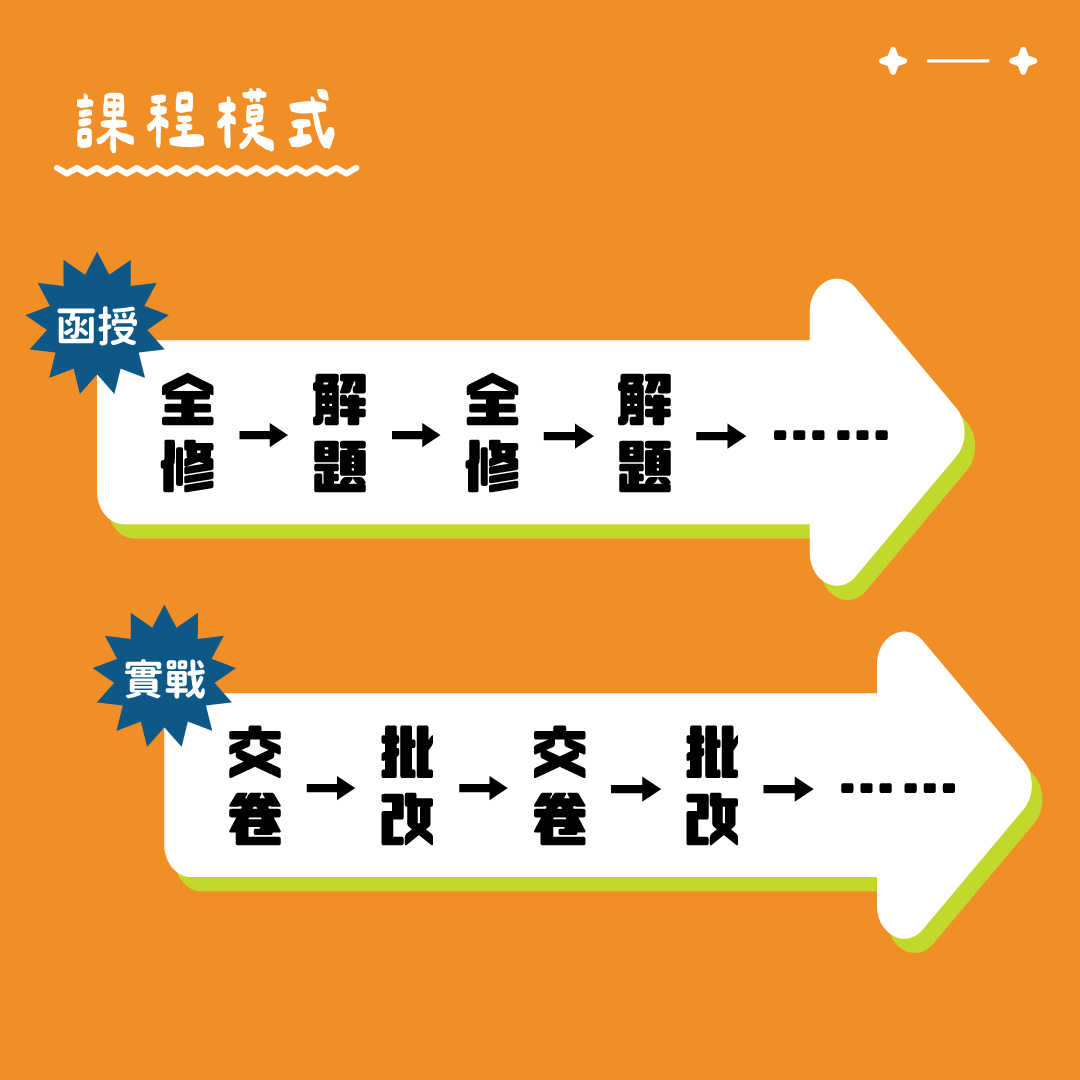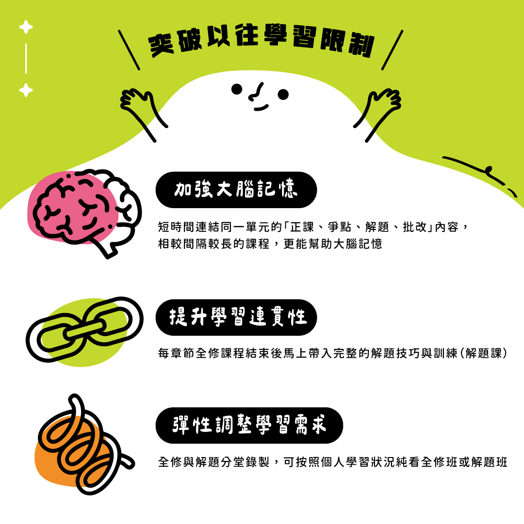 全能班集「全修班、解題班、批改服務」於一身,由每一位老師針對科目最佳學習模式量身打造!全修與解題一貫式融合課程──全修課程結束後馬上帶入完整的解題技巧與訓練,並由原班師資親自批改。 一邊輸入、及時輸出,再也不用自己翻閱解題書、或是等一整輪正課上完後才能上解題班。 |